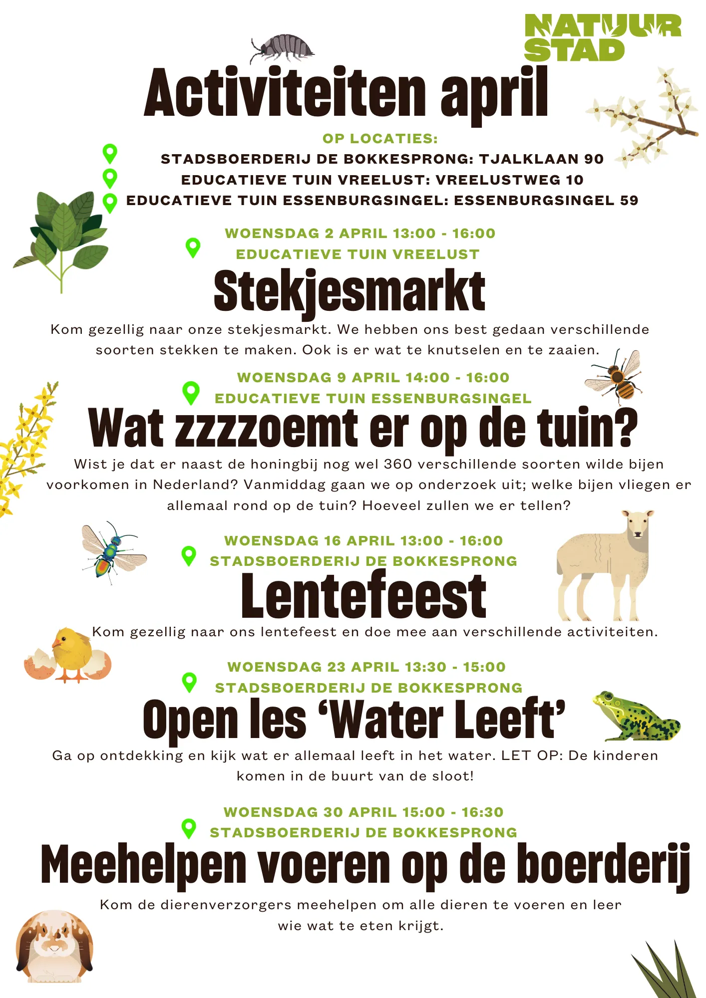 In april en mei hebben we op Educatieve tuinen Vreelust en Essenburgsingel, en op stadsboerderij De Bokkesprong weer verschillende woensdagmiddagactiviteiten. Elke woensdagmiddag is er wel iets leuks te doen in de buurt vanuit Natuurstad.