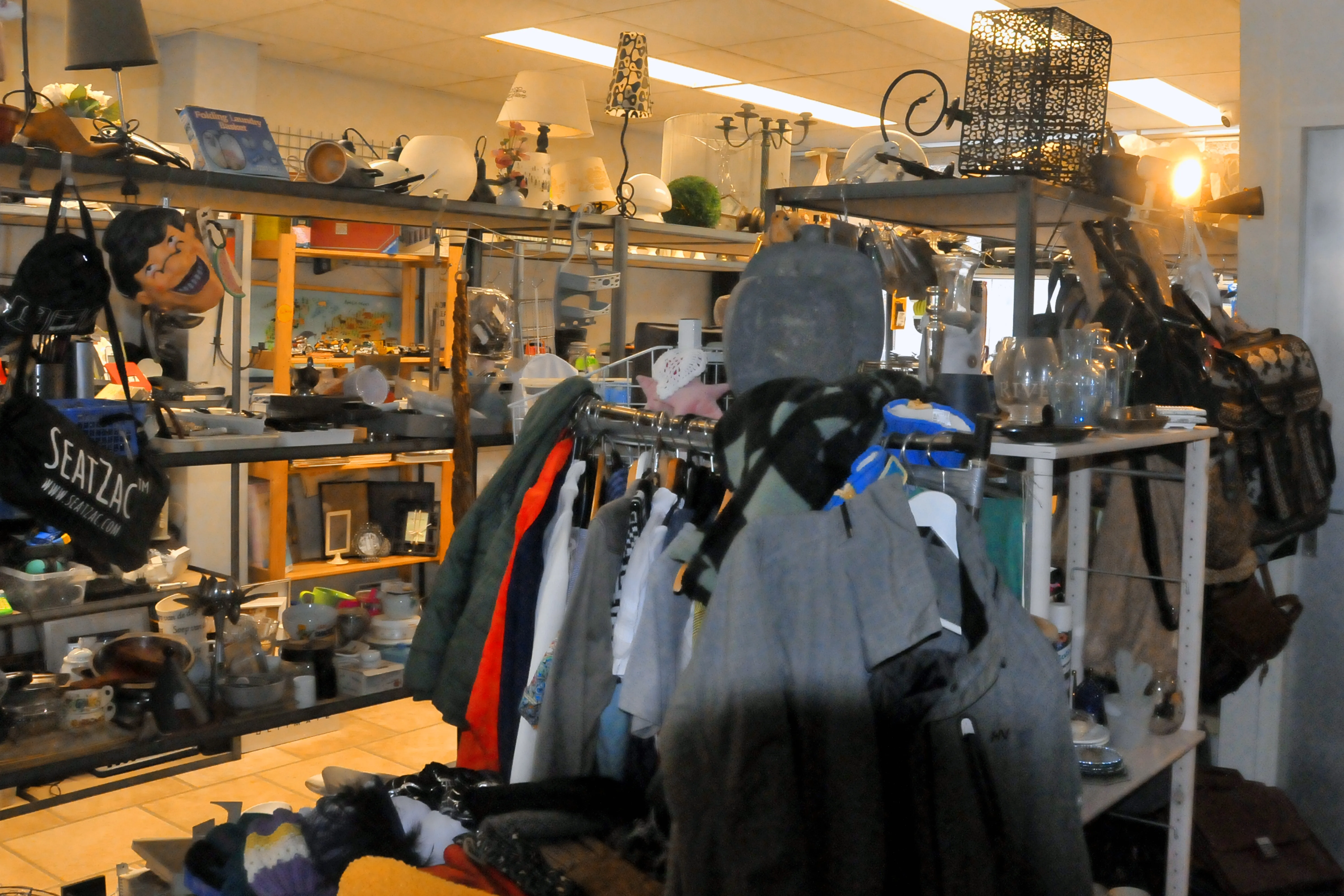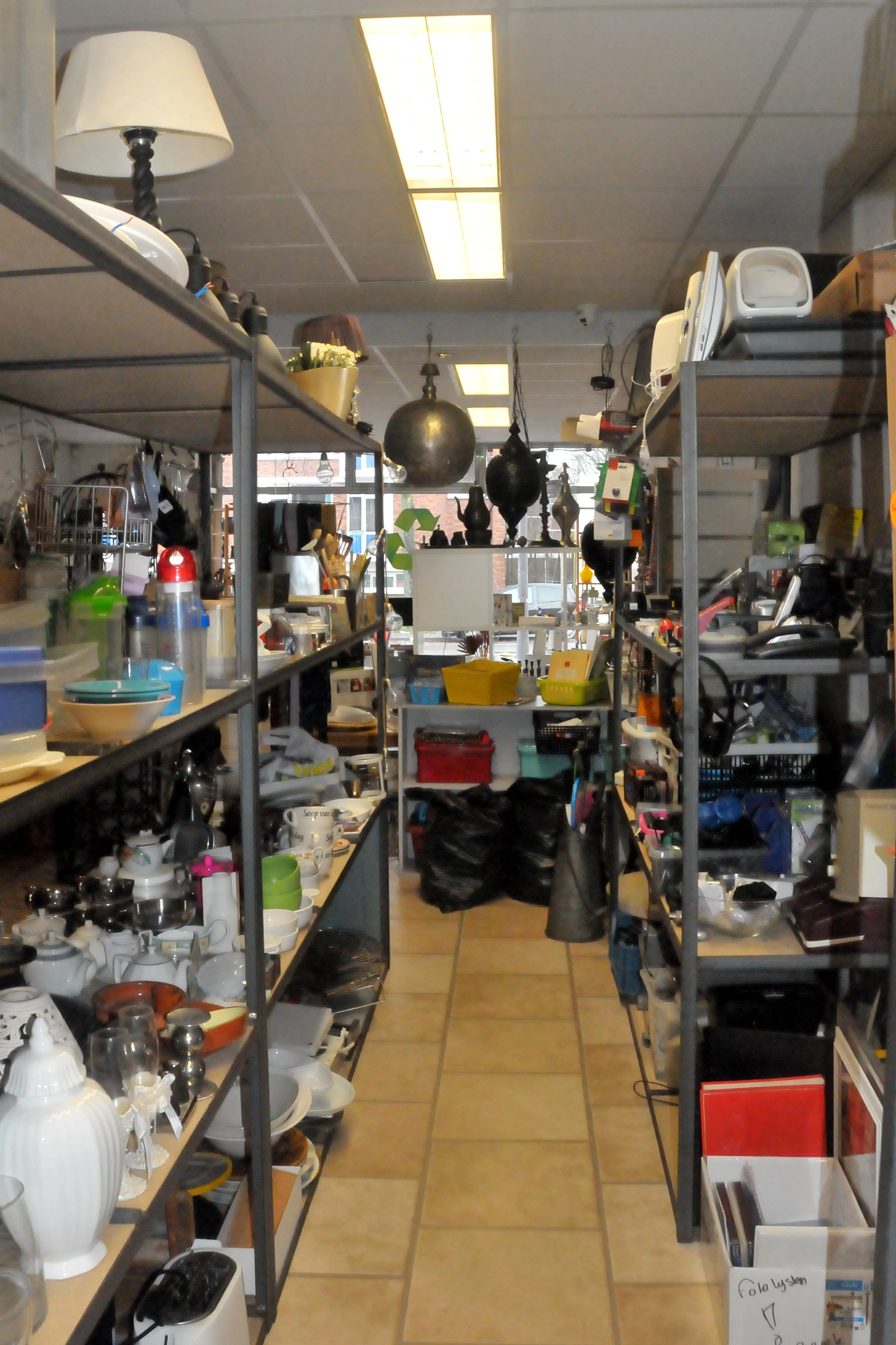 Binnen is het niet heel groot, maar er zijn genoeg spullen om doorheen te snuffelen. Er staan een paar schoenen zo goed als nieuw, compleet met schoenendoos. Kledingrekken met lange wintermantels. De stellingkasten in de winkels staan vol met van alles. Stapels servies, een plank vol oude modelauto’s. Platen, en zelfs wat planten. Van kinderboeken tot de rollator op de stoep: er is voor ieder wat wils.