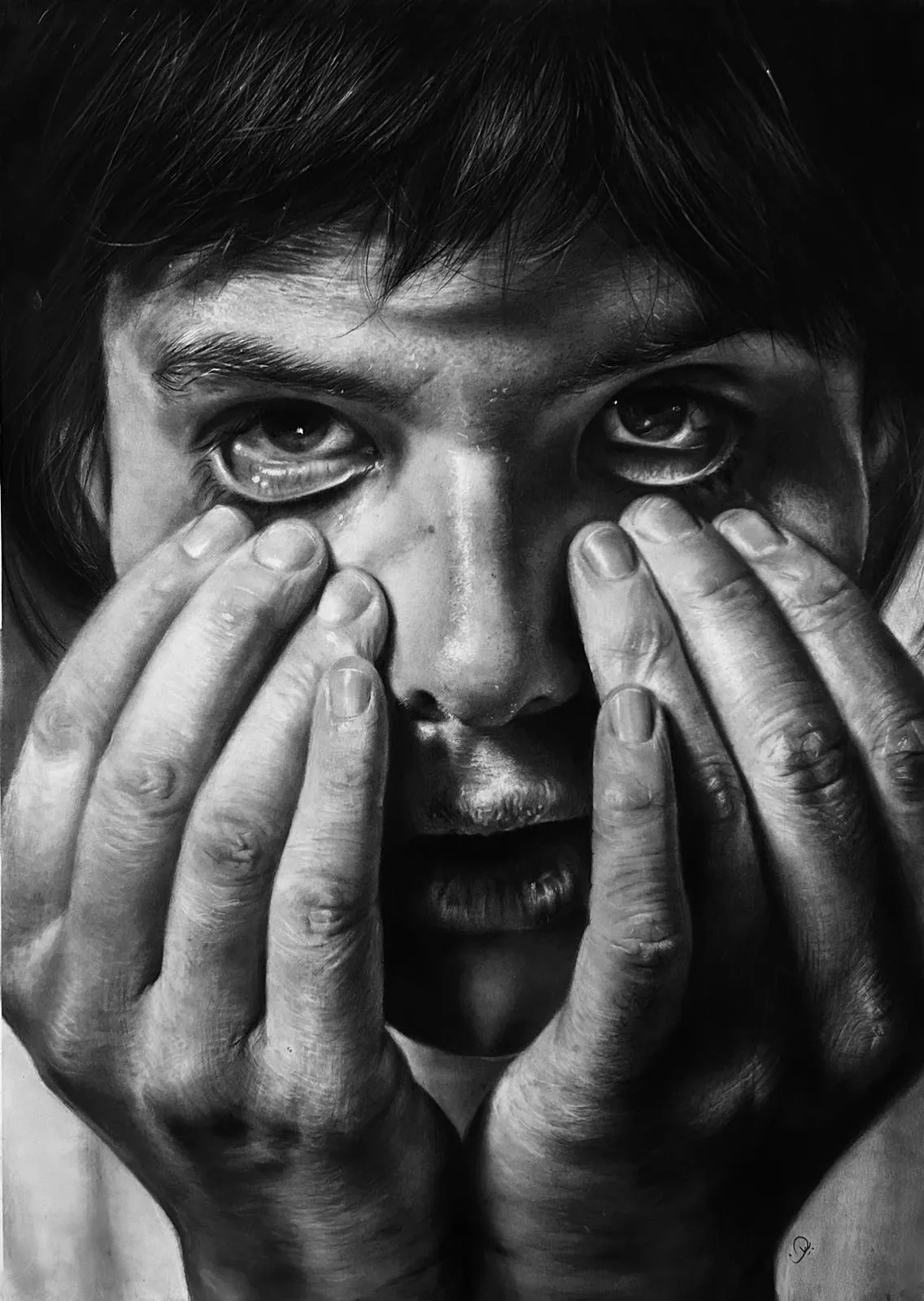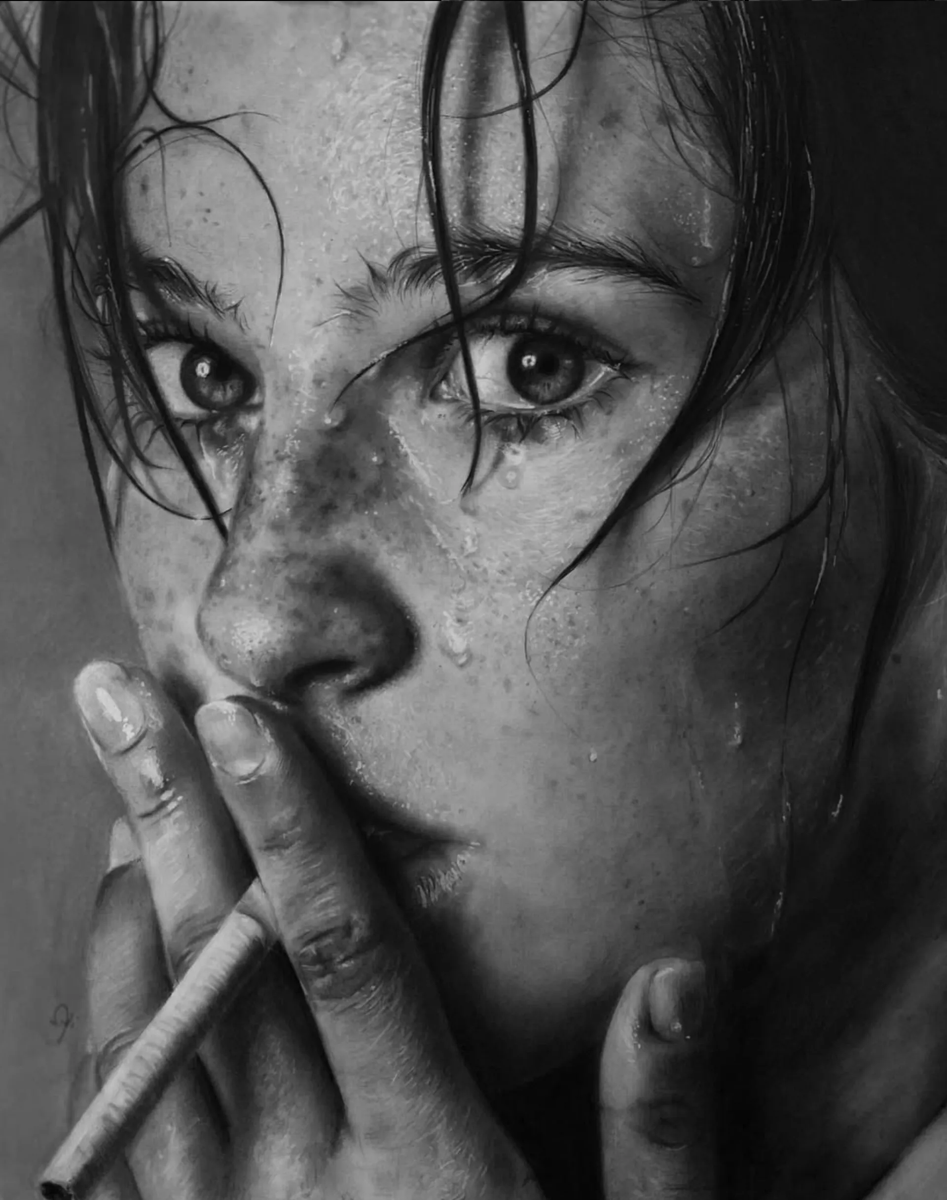 Je vindt de hyperrealistische kunst, getekend met potlood en houtskool, van Bayan Alalo op Instagram: @BAYANN963.
