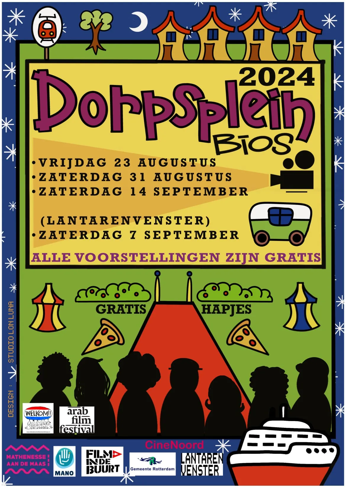 De openluchtbioscoop avonden vinden plaats op het Dorpsplein, op het terrein tegenover Marconistraat 52, ter hoogte van het schip Silja Europa. Het voorprogramma start om 20:00, de filmvertoning rond 21:00.