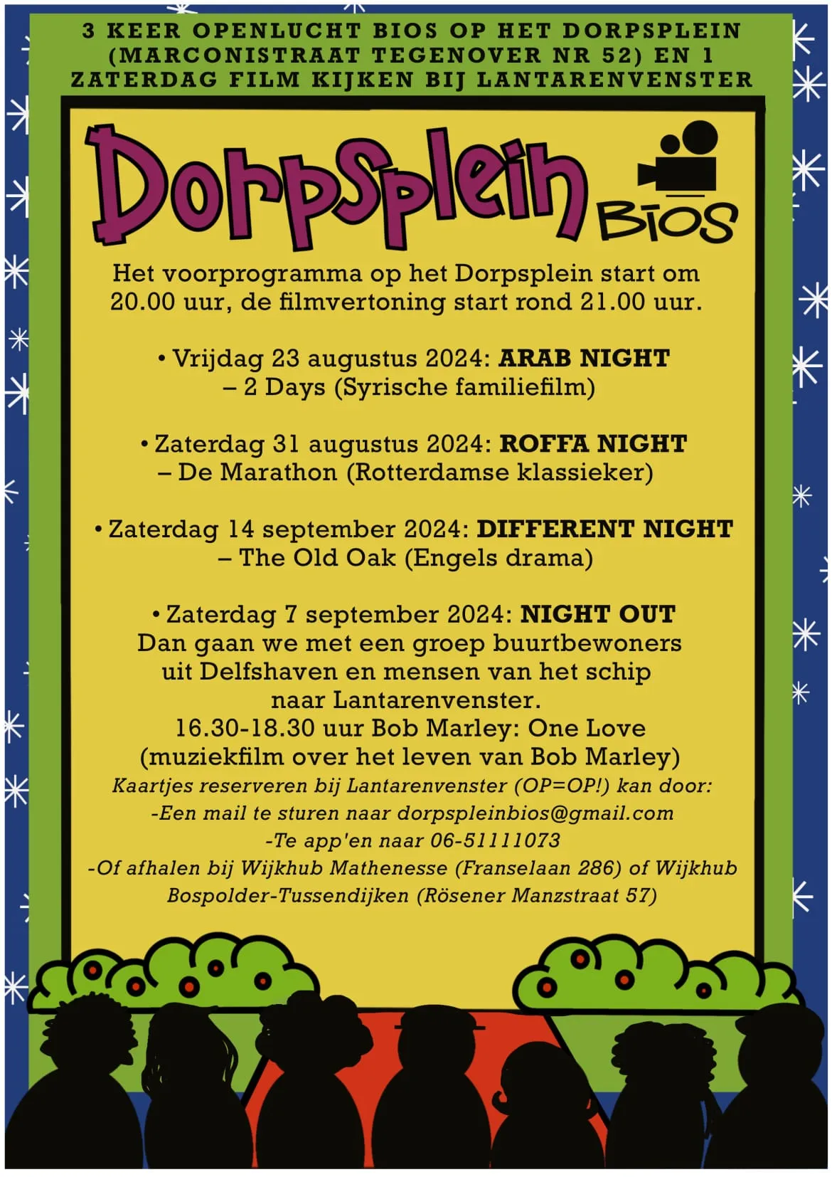 Voor het Lantarenvenster kun je een kaartje reserveren door een e-mail te sturen naar: dorpspleinbios@gmail.com of stuur een Whatsapp bericht naar: 06 51111073. Daarnaast zijn de kaartjes af te halen bij Wijkhub Mathenesse (Franselaan 286) of Wijkhub Bospolder-Tussendijken (Rosener Manzstraat 57) Op is op!