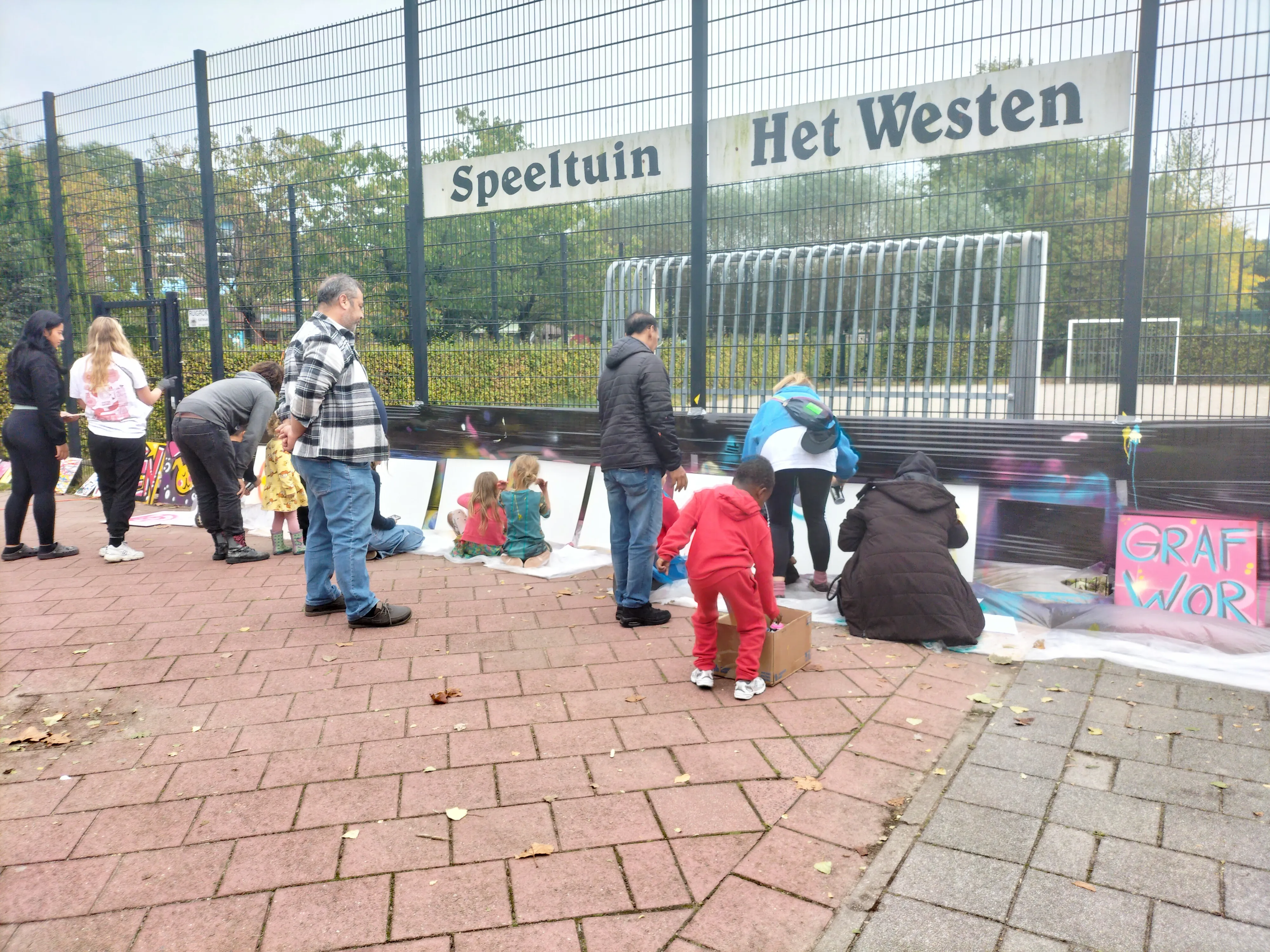 Een stuk verderop staan tafeltjes met ezel en schilderspullen. De tent waarin je een splash painting kan maken, intrigeert en langs het hek staan de doeken en spuitbussen klaar om het vlammetje in een nieuwe generatie creatievelingen te ontsteken. De tafel met lekkere roti en drankjes maakt het geheel af.
