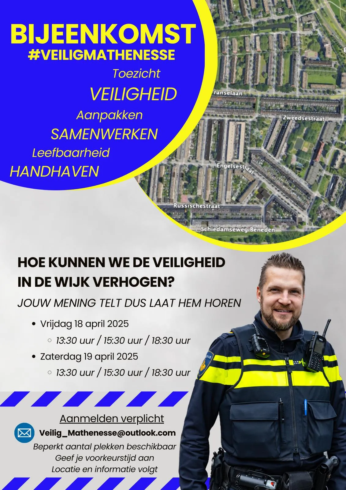 Aanmelden voor de bijeenkomst is verplicht en kan via e-mail: Veilig_Mathenesse@outlook.com of telefonisch via 06-53668088.